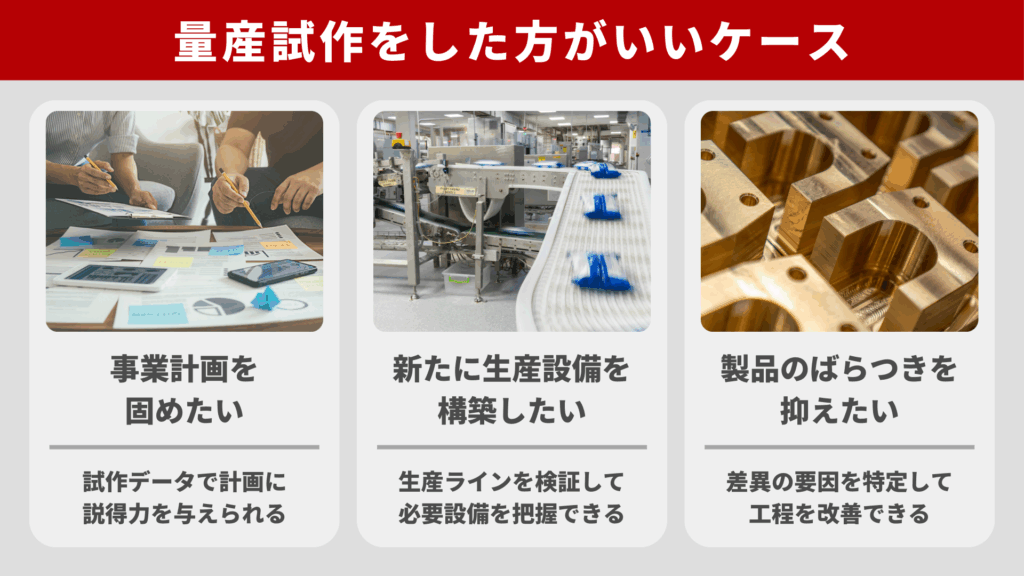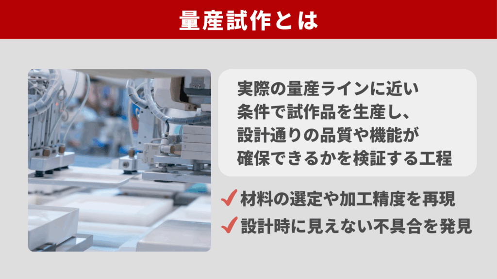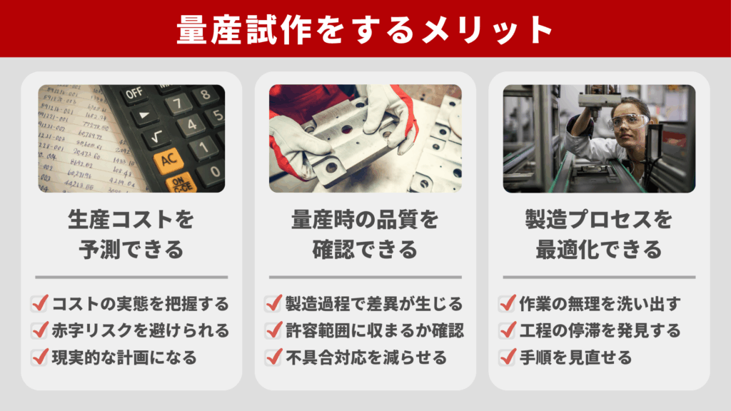 量産試作を通じてこうした課題を洗い出せば、手順の見直しや設備の調整など、効率化につながる改善策を実施できます。