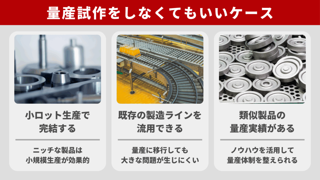 すでに稼働している製造ラインで対応できる製品であれば、量産試作を省略しても問題ありません。既存の設備や工程にそのまま組み込める場合、量産に移行しても大きな問題が生じにくく、設備投資や教育にかかるコストも軽減できます。