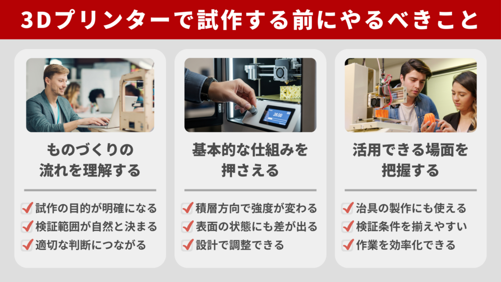 流れを理解していれば、今回は外観確認なのか、寸法や強度の検証なのかといった試作の狙いも明確になり、適切な判断もしやすくなります。3Dプリンターを用いたものづくりの流れを詳しく知りたい方は、こちらの記事をご覧ください。