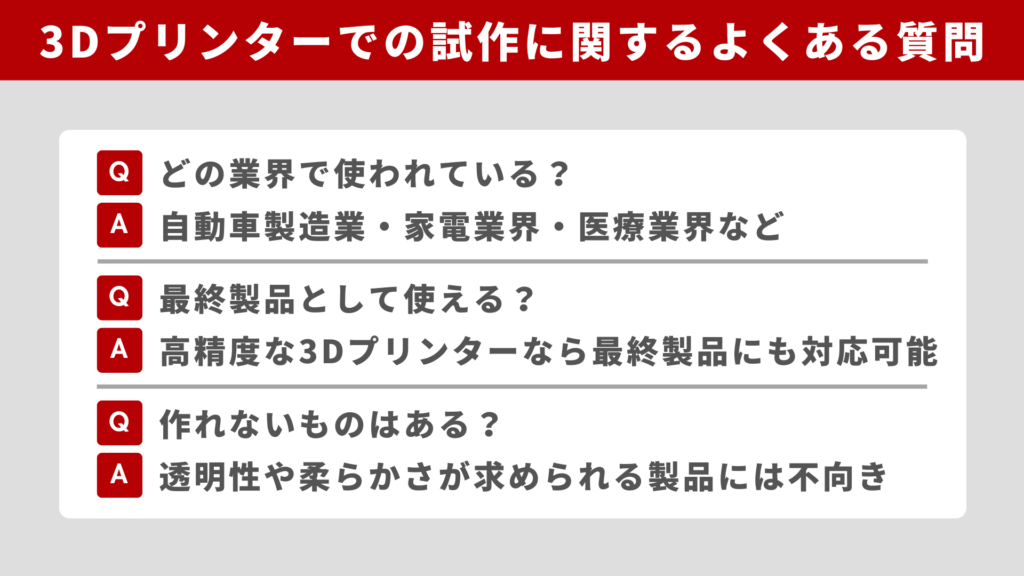 試作に取り組む際は、3Dプリンターに関するよくある質問も確認しておくと安心です。